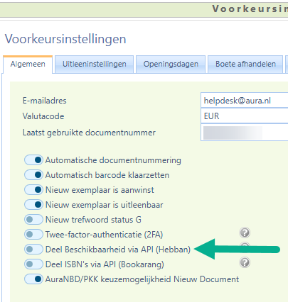 - Medewerkers van de mediatheek kunnen bij Systeemonderhoud | Voorkeursinstellingen | tabblad Algemeen de optie 'Deel beschikbaarheid via API (Hebban)' aanvinken om de koppeling te activeren
