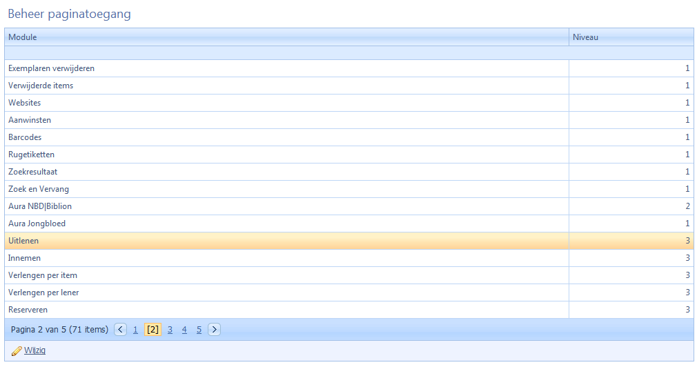 In bovenstaand voorbeeld hebben gebruikers met niveau 2 (Assistent mediathecaris) alleen toegang tot de pagina’s met Uitlenen; Innemen; Verlengen per item; Verlengen per lener; Reserveren én Aura NBD | Biblion. Gebruikers met niveau 3 (vrijwilligers) kunnen alleen bij de de pagina’s met Uitlenen; Innemen; Verlengen per item; Verlengen per lener; Reserveren én niet bij Aura NBD | Biblion.