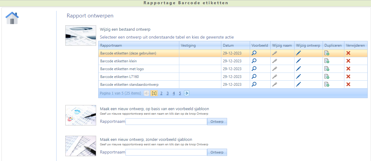 Figuur 9-3: Scherm voor het beheer van de rapportontwerpen voor de barcode-etiketten.