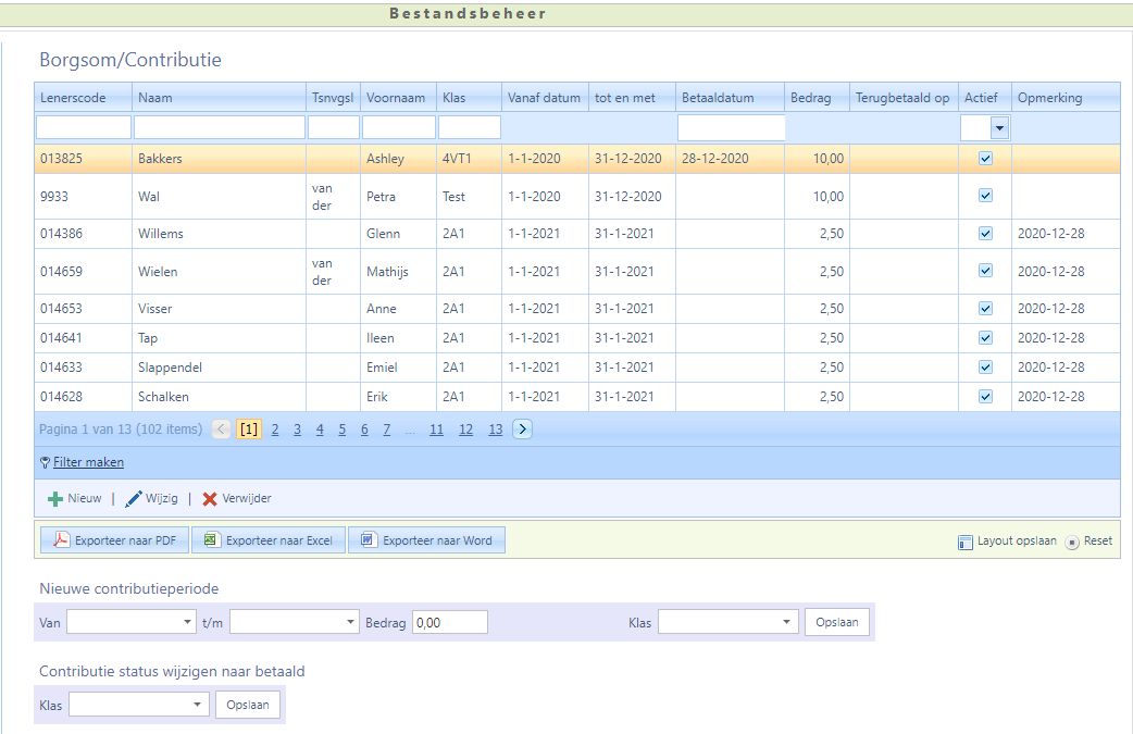 Na afloop van een contributie-jaar kan een zelf ingestelde periode per klas ingesteld worden met een zelf in te stellen bedrag per klas. Bij de records van de vorige contributie-periode wordt het vakje Actief dan automatisch uitgevinkt.
