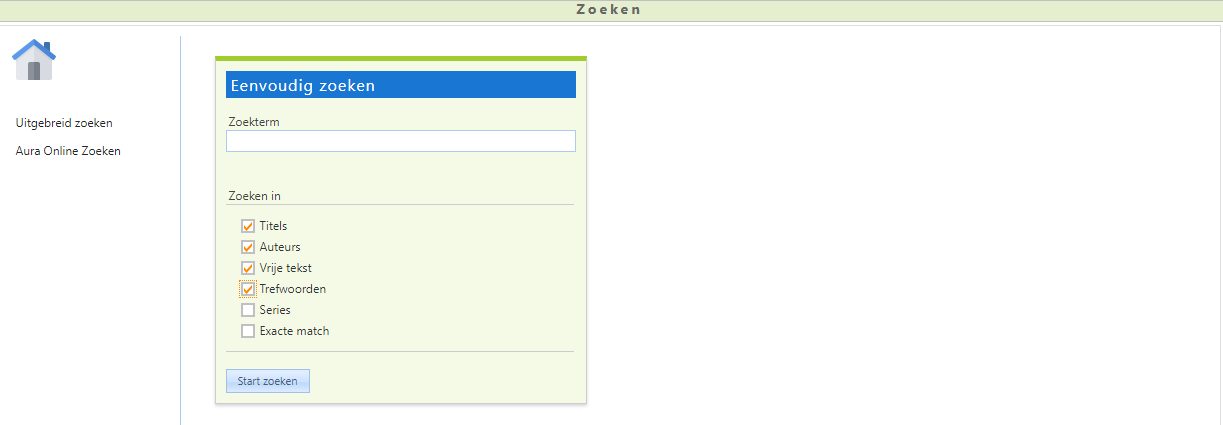 Via de Voorkeursinstellingen (kies in Aura Online Beheer voor Systeemonderhoud | Voorkeursinstellingen | Tabblad Aura Online Zoeken) kunt u instellen welke zoekvelden standaard wel/niet aangevinkt moeten zijn. De gebruiker kan dit natuurlijk altijd nog naar eigen wens aanpassen