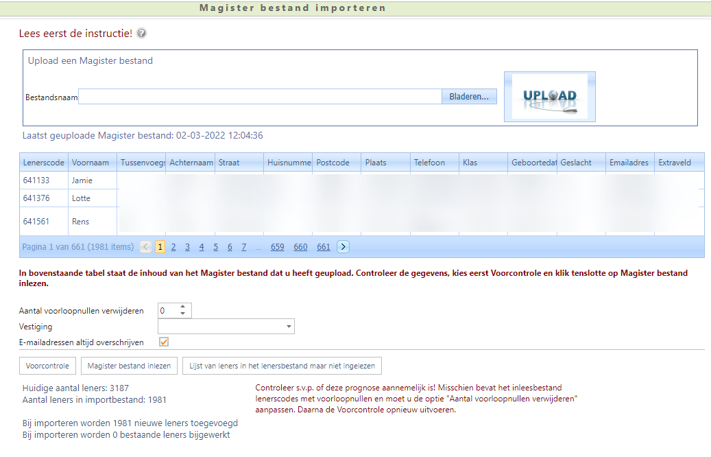 - Controleer wederom of het aantal nieuwe leners dat zal worden toegevoegd aannemelijk is. Zo ja, klik op de knop Magister bestand inlezen.
