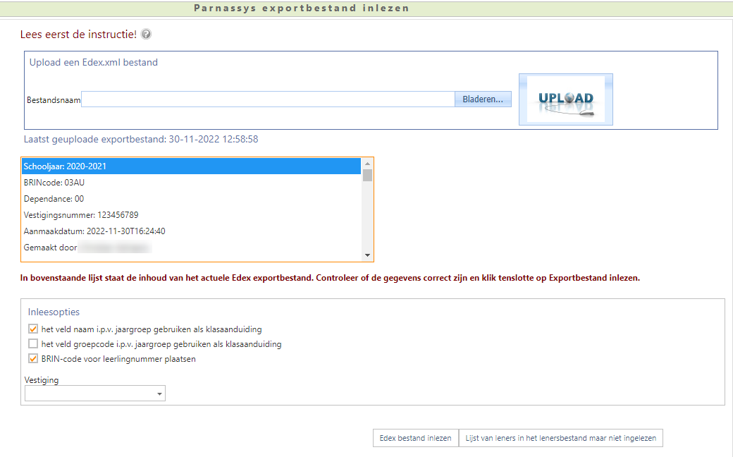 - Klik op de knop Bladeren en selecteer het Edex.xml exportbestand uit Parnassys/Esis.