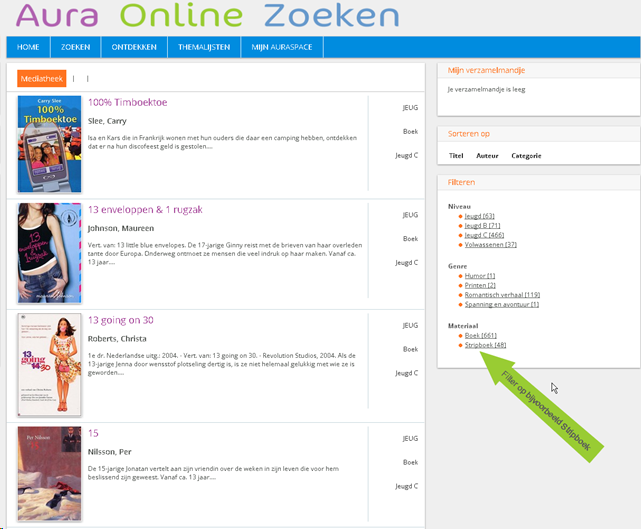 Filter bijvoorbeeld op Materiaalsoort Stripboek en je houdt alleen Stripboeken over. In bovenstaand voorbeeld zijn dat 48 titels.