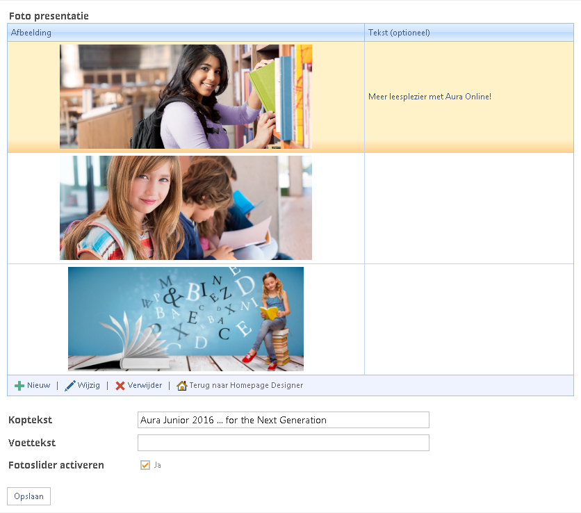 U kunt hier foto’s uploaden van uw organisatie/bibliotheek. Klik op het zwarte blok Fotopresentatie: er opent een nieuw scherm: