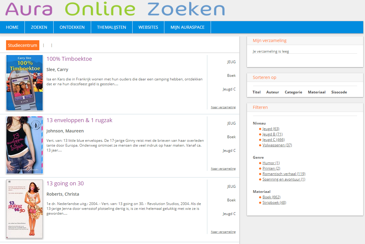 Nadat je de zoekcriteria hebt ingevuld en op de knop Zoeken hebt geklikt, laat Aura het Zoekresultaat zien: een lijst van de gevonden titels.