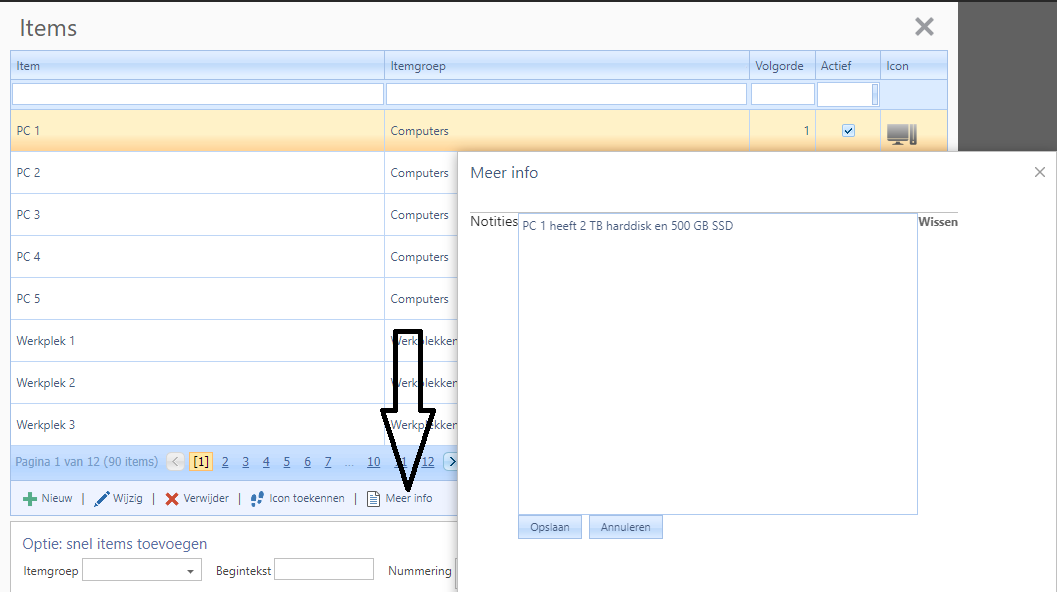 M.b.v. de knop "Meer info" kunt u informatie toevoegen voor het geselecteerd item. Bijvoorbeeld in reparatie, service contract enz.
