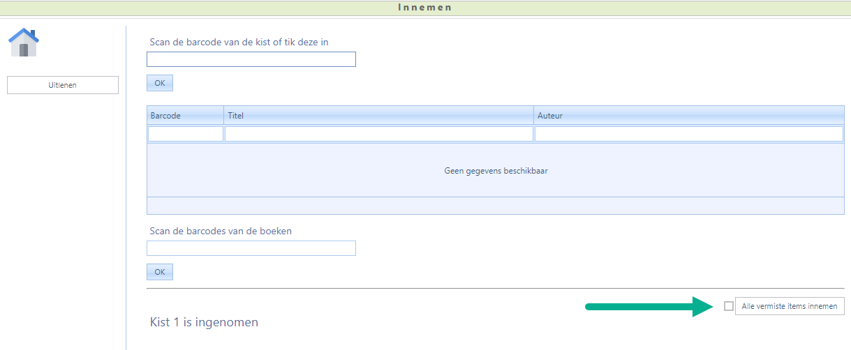 - Als er boeken ontbreken, maar u wil deze toch innemen om deze daarna te verwijderen uit de catalogus, kunt u gebruik maken van de optie Alle vermiste items innemen