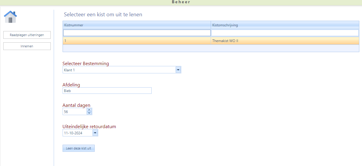 - Selecteer de kist die u gaat uitlenen uit het overzicht