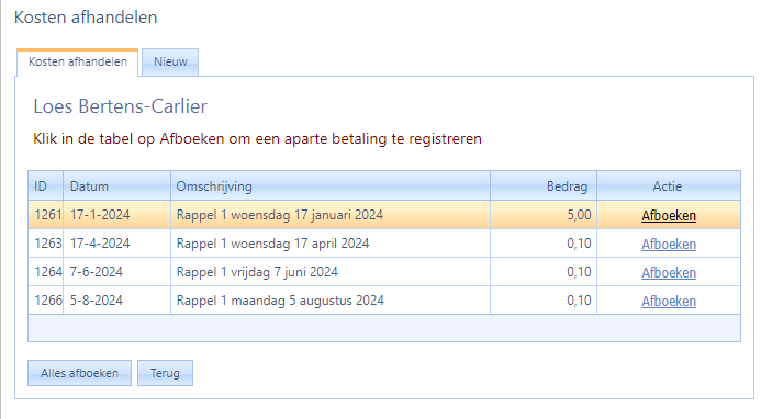 - Als de leners slechts een deel van de kosten kan/wil betalen dan kunt u per kostenpost afrekenen, klik in de tabel op de knop Afboeken op de regel van de kostenpost die wordt betaald.