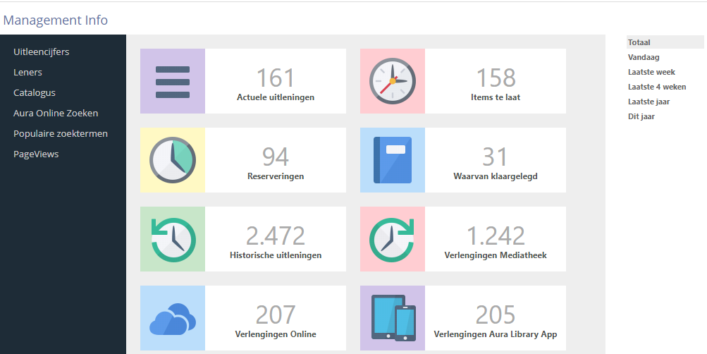 In het tabblad Aura UitleenAdminstratie kunt u ook nog de periode kiezen waarover u de informatie wilt opvragen: Totaal; Vandaag; Laatste week en Laatste 4 weken.