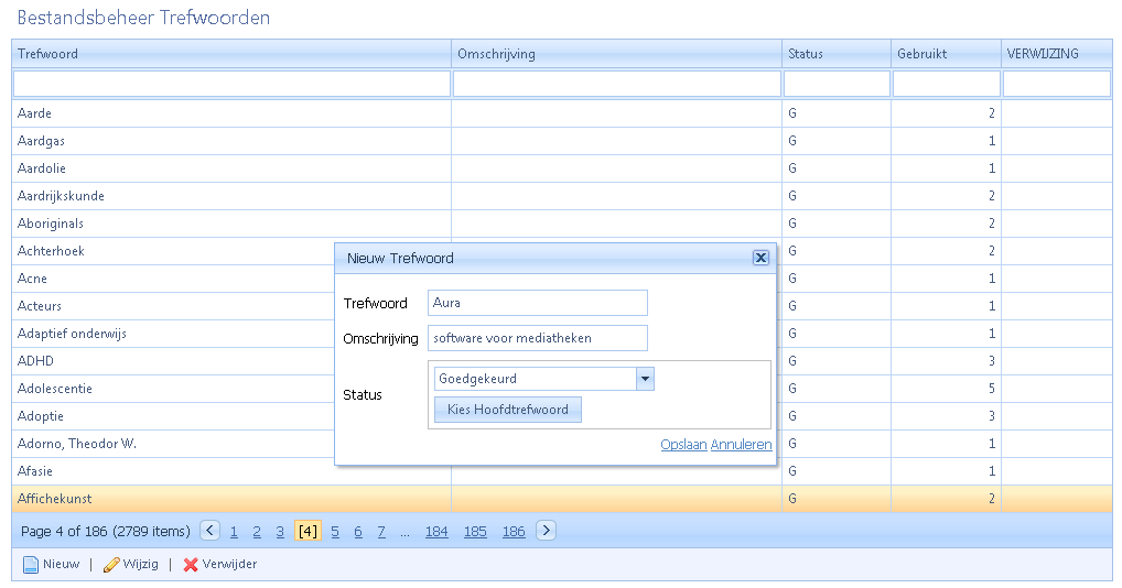 U kunt op twee manieren nieuwe trefwoorden aan de keuzelijst toevoegen: tijdens het invoeren of wijzigen van een titelbeschrijving (zie ‘Trefwoorden’) en via trefwoordbeheer: