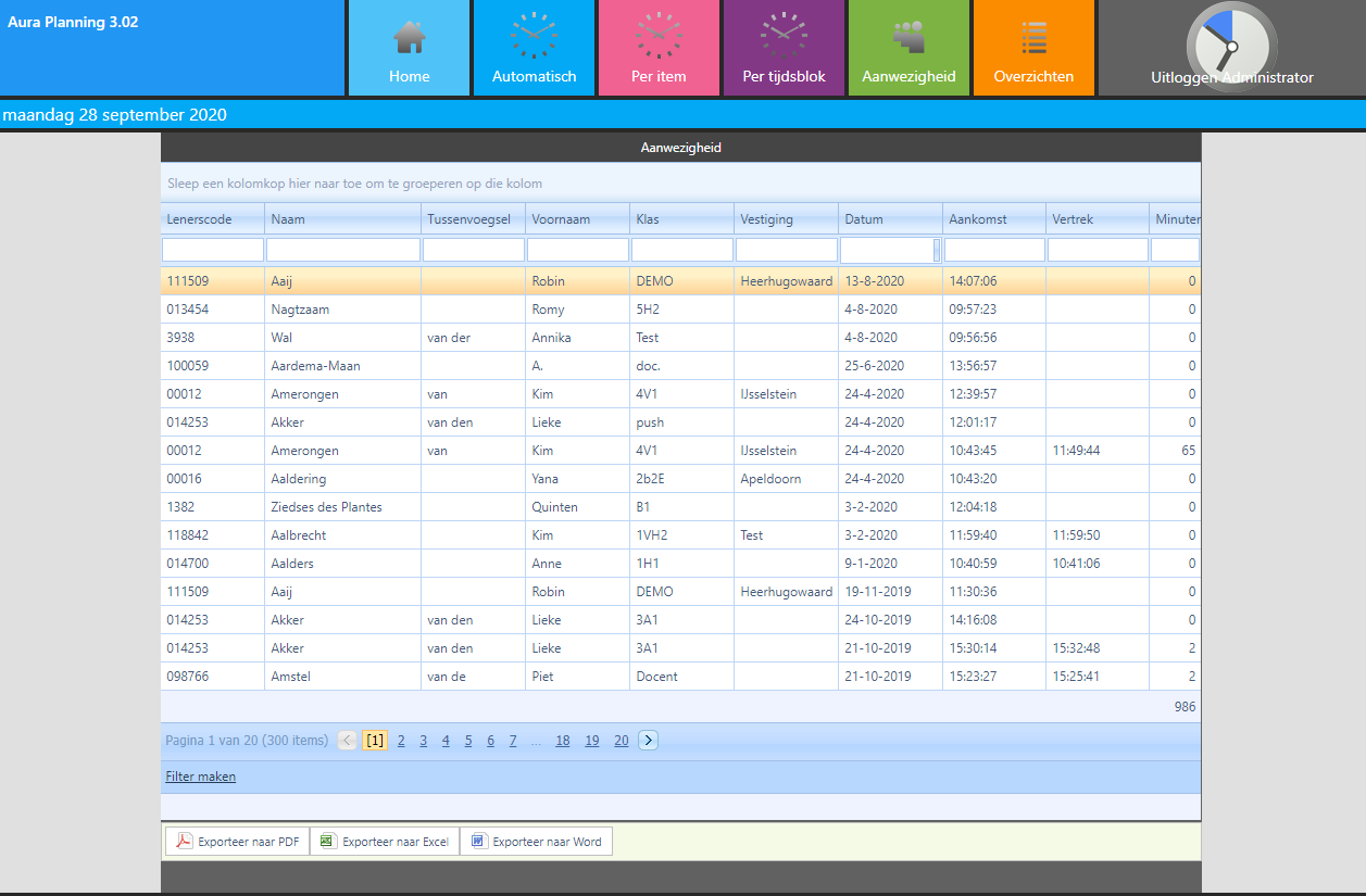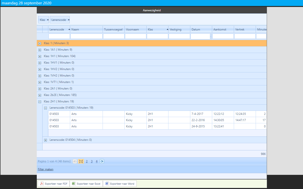 Sleep eerst de klas en vervolgens de lenerscode of naam naar boven; dan krijgt u een overzicht per klas (met totaal aantal minuten) en per lenerscode/naam (met totaal aantal minuten) en wanneer u bij een plusje de lijst open klapt, ziet u het exacte overzicht uitgesplitst.