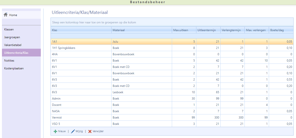 - Kies Aura UitleenAdministratie | Uitleencriteria | Per Klas/Materiaal