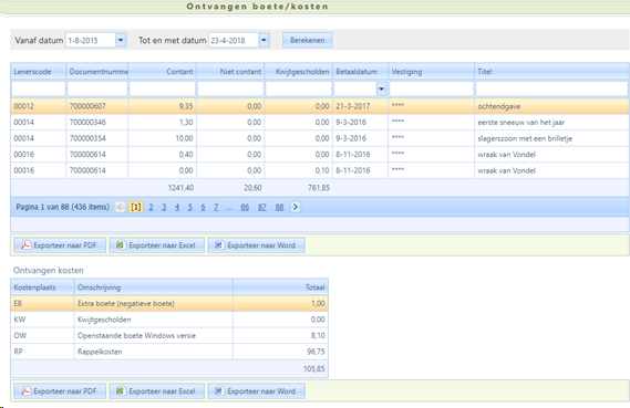 Hier kunt u opvragen hoeveel boete/kosten u – over een op te geven periode – heeft ontvangen. De kosten worden per kostenplaats uitgesplitst.