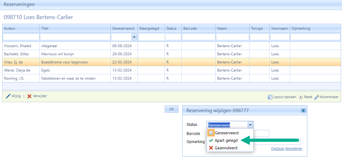 Soms kan het nodig zijn om de status van een gereserveerd boek aan te passen van ‘R’ naar ‘A’ of andersom.