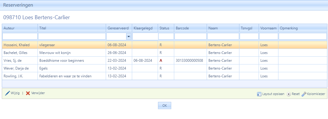 U ziet nu een overzicht van alle gereserveerde titels - Plaats de cursorbalk op de reservering die u wilt wijzigen