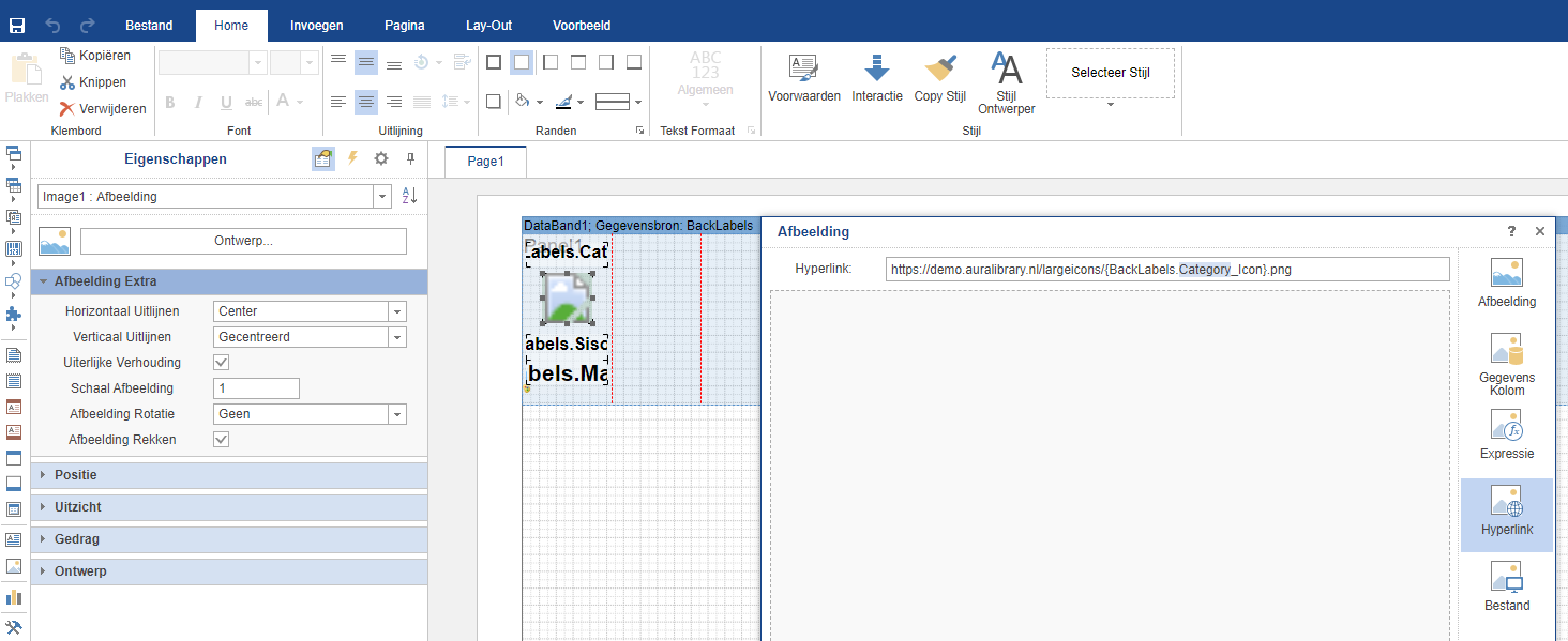 Wilt u een Genre-icon of PIM-icon afgedrukt hebben op een rugetiket? Dupliceer dan het standaardontwerp en wijzig in de URL Category in Genre of Country voor PIM-icon. Klik vervolgens op OK en vergeet niet het rapportontwerp zelf op te slaan.