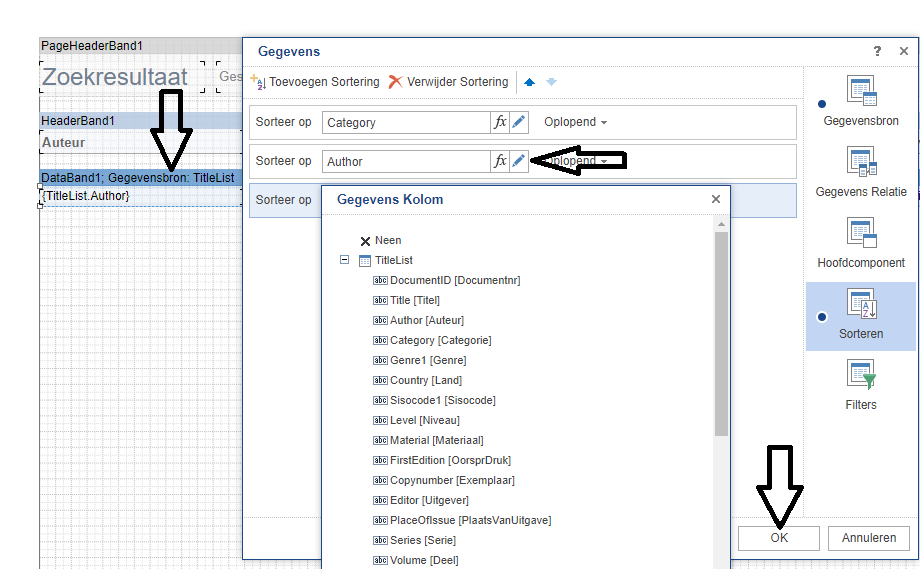 (klik op het knopje achter het veld voor de keuzelijst) - Klik op de knop Toevoegen Sortering