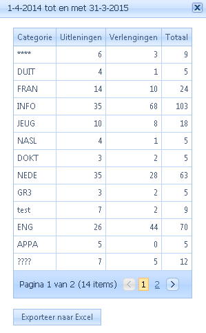 Bij het opvragen van de uitleningen per Categorie ziet u in de grafiek en tabel ook een Categorie=????.