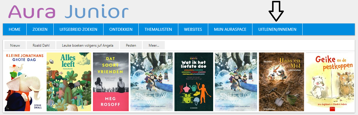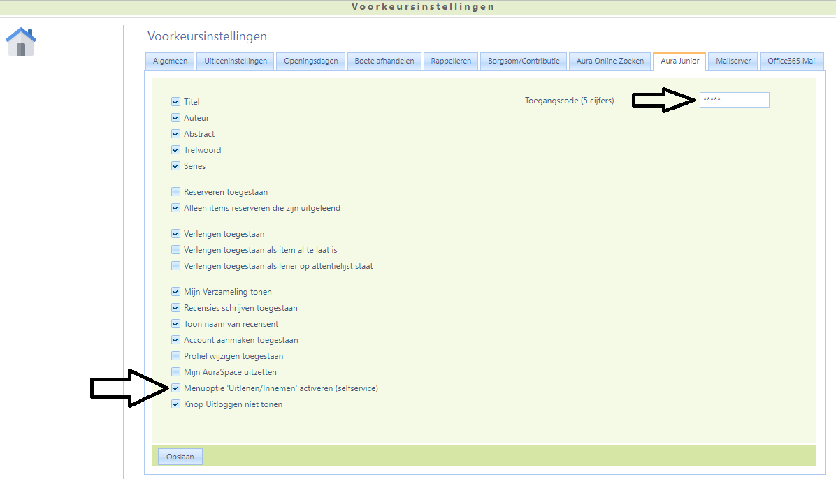 Naast de instellingen die vergelijkbaar zijn met de instellingen voor Aura Online Zoeken kunt u hier kiezen voor het activeren van de Menu-optie 'Uitlenen/Innemen' (selfservice).
