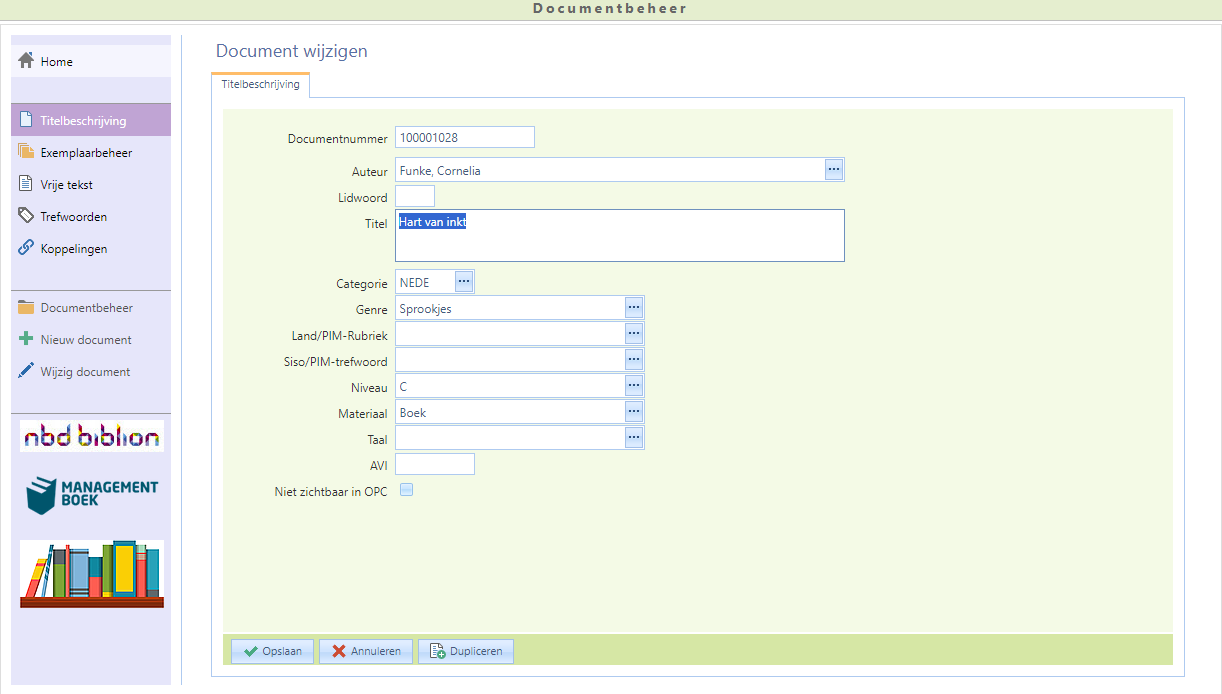 - Of u kunt met de knop Naar Documentbeheer meteen naar het wijzigscherm van Aura Catalogusbeheer gaan en daar nog meer aanpassingen doen en bijvoorbeeld de trefwoorden aanpassen.