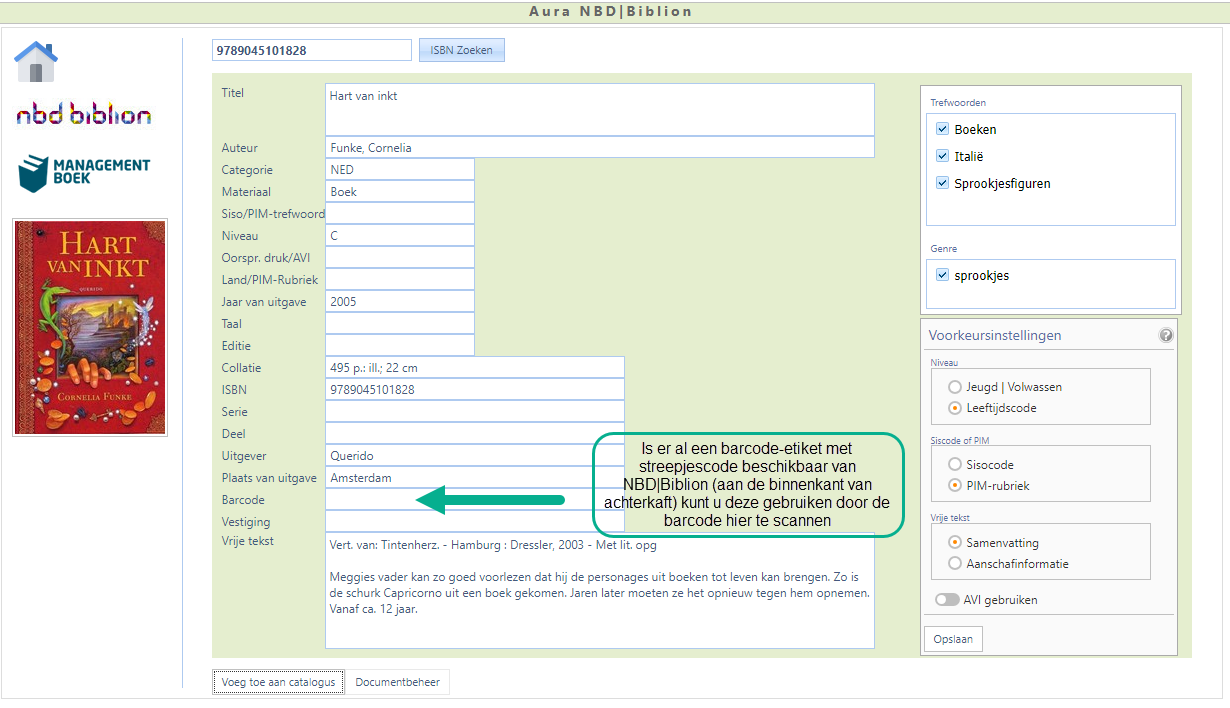 Een wisselcollectie van de Openbare Bibliotheek kunt u ook via Aura NBD|Biblion invoeren door het ISBN-nummer en de Barcode van het boek van de Openbare Bibliotheek in de betreffende velden te scannen.