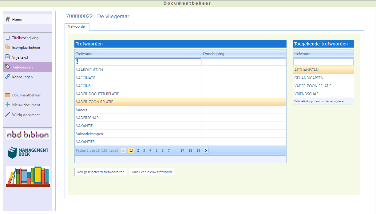 (Raadpleeg ‘Keuzelijsten’ voor meer informatie over opzoeken en selecteren in keuzelijsten). - Klik op de knop Ken geselecteerd trefwoord toe of dubbelklik