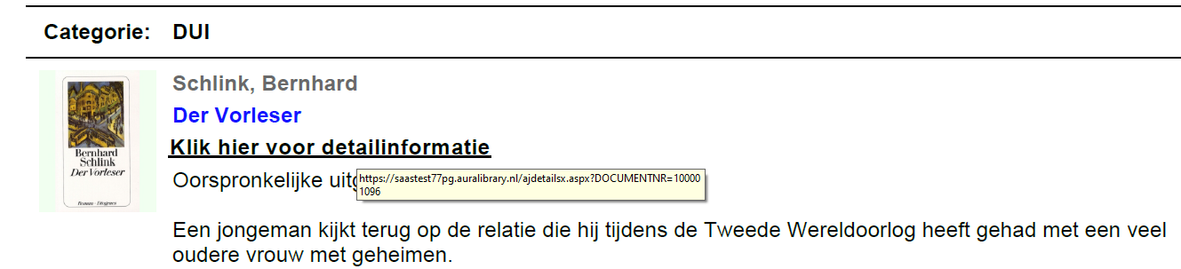 Voor de aanwinsten- en themalijsten is een link naar het detailscherm van de betreffende titel opgenomen. Als u hiervan gebruik maakt, vergeet dan niet om de link aan te (laten) passen naar de URL van uw Aura Online site!