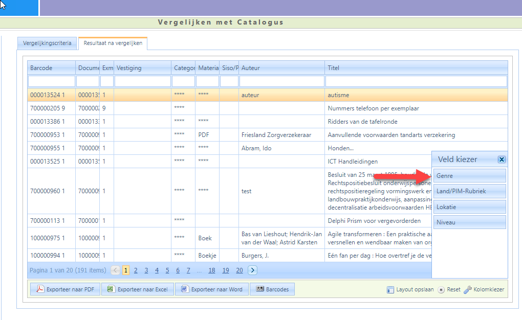 Bij Vergelijken met Catalogus is aan de kolomkiezer het veld Genre toegevoegd.