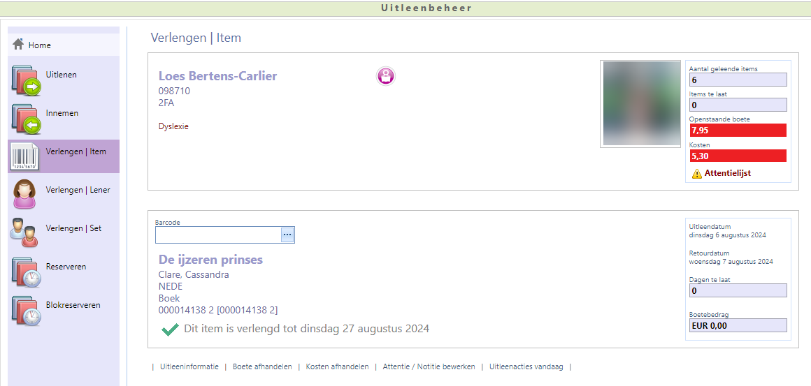 De uitleentermijn is nu verlengd. De cursor staat weer in het veld Barcode.