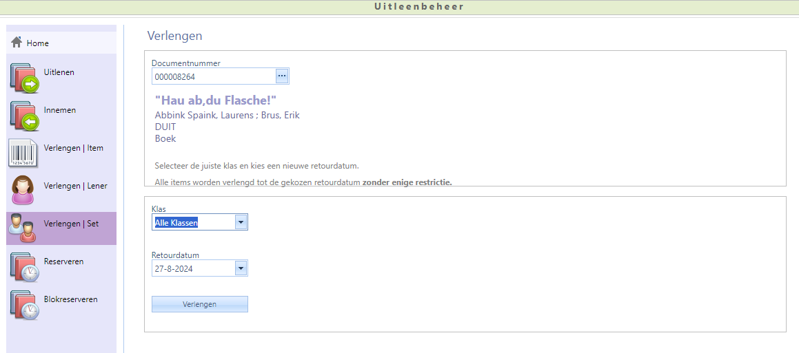 - Kies UitleenAdministratie | Uitleenbeheer | Verlengen per set