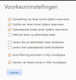 25 Aura Planning Voorkeursinstellingen Hier kunt u aangeven welke informatie over de lener u wilt tonen tijdens het plannen en of een reservering in bepaalde gevallen moet worden geblokkeerd. Kies Instellingen Vink de gewenste opties aan Kies Opslaan