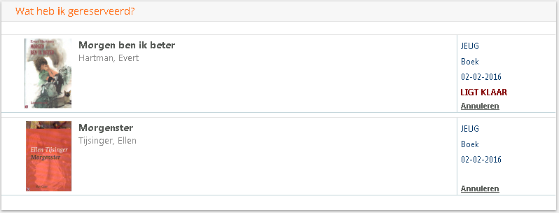Hier kun je precies zien welke titels je hebt gereserveerd. Als het gereserveerde boek intussen is ingeleverd door de vorige lener, dan staat rechts naast de titel Ligt klaar.