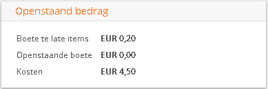 Boete te late items: in het blok Wat heb ik geleend? kun je zien welke boeken te laat zijn. Over deze boeken moet je boete betalen als je ze inlevert of verlengt. Als je de boeken vandaag inlevert of verlengt is dit de boete die je moet betalen. Let op: de boete over deze boeken wordt elke dag dat je ze niet inlevert of verlengt hoger!
