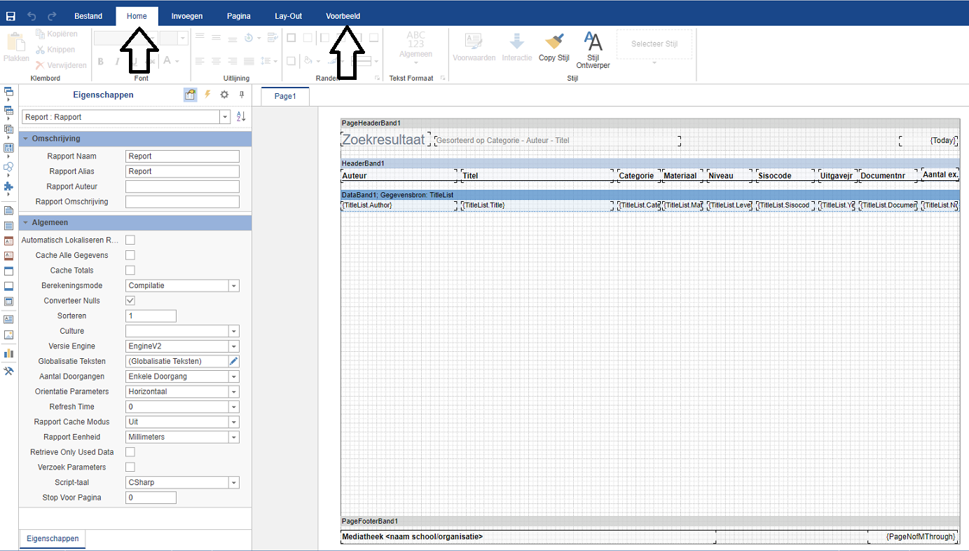 In dit afdrukvoorbeeld ziet u altijd dezelfde titels staan, die horen bij het standaardrapport van het zoekresultaat. Het is helaas niet mogelijk om hier titels te laten zien die uit uw eigen catalogus komen. - Klik op de tabkaart Home